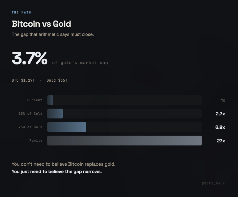 Bitcoin is the most liquid, most battle-tested, digital exit (digitization is inevitable) from that machine, and it’s still sitting at 3.7% of gold’s market cap. The gap is absurd.