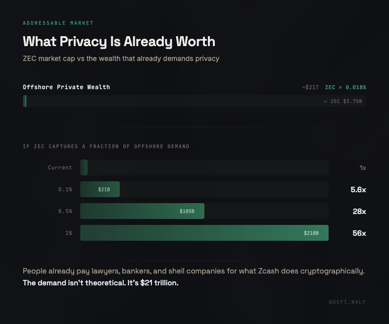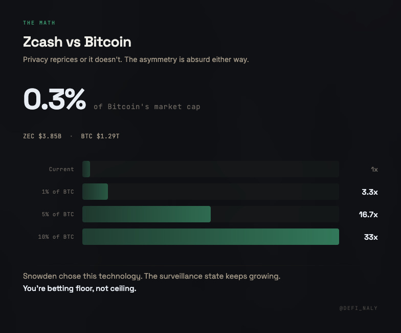 Now. Will it? I don’t know. Nobody does, and anyone who tells you they’re certain is selling you something, but the risk/reward profile is genuinely absurd. You’re not betting on ZEC becoming Bitcoin. You’re betting that a working privacy layer for money has some value in a world where every transaction is indexed, analyzed, and sold to the highest bidder.